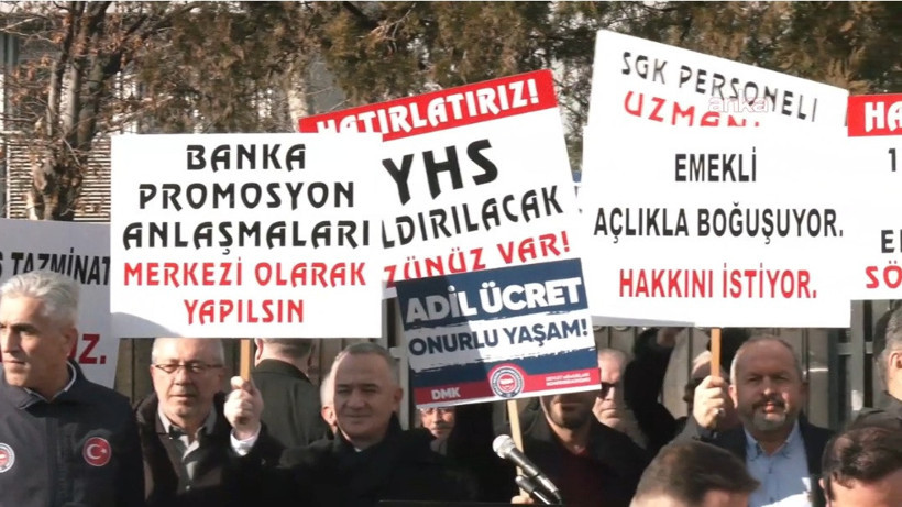 Devlet Memurları Konfederasyonu, Hazine ve Maliye Bakanlığı önünde TÜİK’in açıkladığı enflasyon sayılarını protesto etti. Protesto sonrası Devlet Memurları Konfederasyonu Genel Başkanı Osman Kaya, “2026 yılında memurlara verilen artırım oranı muhakkak oldu. Beklediğimiz oranlar bu değil. Bu oranlarla memurun yıl sonunu getirmesi mümkün değil. Bugün bir memur emeklisi en ucuz pansiyon nerede, nerede kalabilirim diye bir arayış içerisine girmemeli. Yıllardır devlete hizmet etmiş memurun, memur emeklisinin hak ettiği maaş artırımları yapılmalı” dedi. Bir sendika üyesi ise “Evi alamıyoruz. Otomobil alamıyoruz. Hani geçim derdi. Çocuklarımızın okulları. Çocukların okul masrafları, kıyafetleri. Minimum fiyata artırım geldi. Artırım geldikten sonra marketler yüzde 40 artış yaptı. Daha minimum fiyatlı artırım almadan her şeye artırım geliyor. Otobüse biniyoruz. Otobüs 35 lira olmuş. Ne yapacağız? Nasıl geçineceğiz?” kelamlarıyla sitem etti.