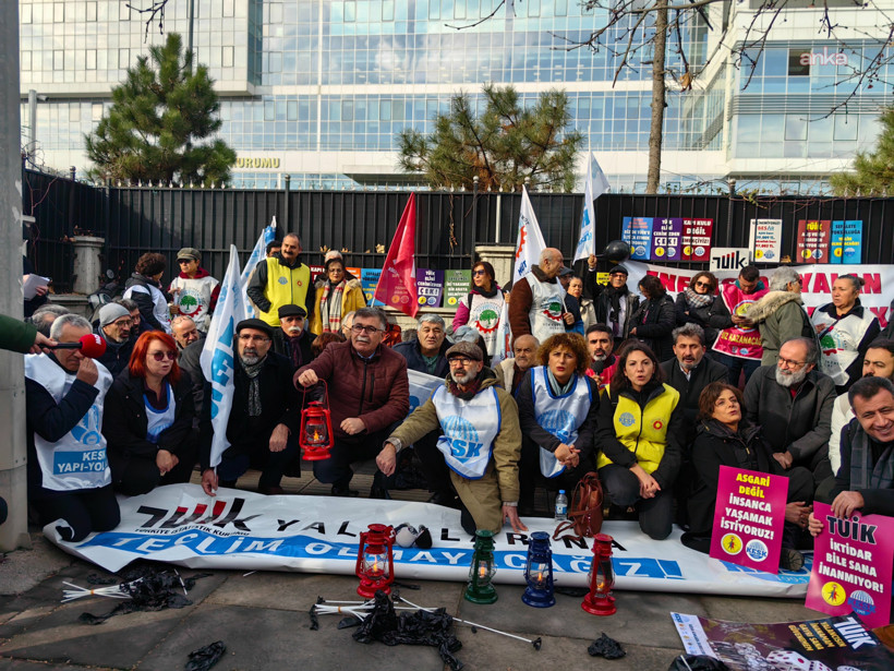 Enflasyon datalarına reaksiyon gösteren Kamu İşçileri Sendikaları Konfederasyonu (KESK), TÜİK önünde açıklama yaptı. KESK Eş Genel Başkanı Ahmet Karagöz, “Yıllardır sürdürülen fakirleştirme siyasetlerinden 4 milyon kamu işçisi ve 2,5 milyon kamu emeklisi hissesine düşeni aldı. Maaşlarımız her ay erirken yoksulluğumuz günden güne arttı. Bu ülkenin personeline, taban ücretlisine, emeklisine, kamu işçisine insanca hayat şartları sunmak için gereğince kaynağı vardır. Lakin bu kaynaklar çalışanlara, fakirleştirilen halka değil bir avuç asalağa faiz, teşvik, hazine garantisi olarak aktarılıyor” dedi. Karagöz, ayrıyeten 14 Ocak’ta KESK üyelerini tüm ülkede iş bırakacaklarını açıkladı. KESK Ankara Şubeler Platformu’ndan Mehmet Aydoğdu da “Buraya gelirken Diyojen üzerinden bir kurmaca oluşturduk. Biliyorsunuz Diyojen’in bakış açısını, gerçekleri aradığını. Diyojen bugün yaşasaydı fenerini saray kapılarında yakmazdı. Zati her yer aydınlık, lambalar, projektörler, spotlar, ekranlar… O ışığın kendini ele verdiği yerlere giderdi. Zira karanlık artık oralarda saklanıyor. Diyojen bugün yaşasaydı fenerini üzerinde TÜİK yazan bir binanın kapısında yakardı” dedi.